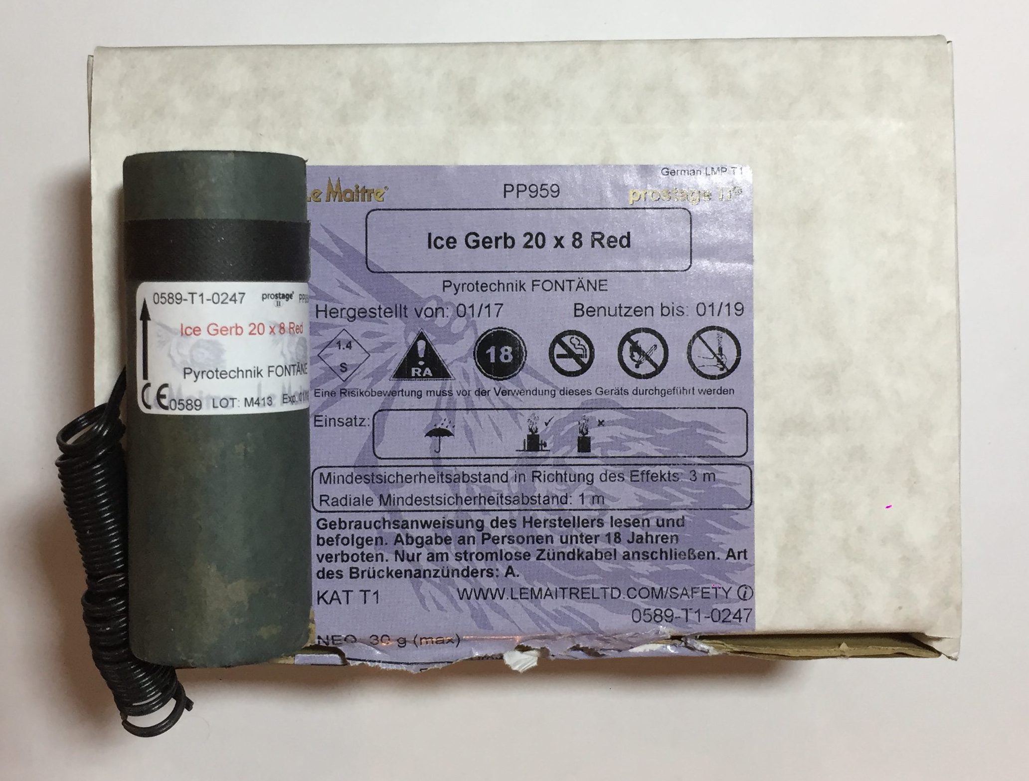 LE MAITRE Ice Gerb 20s x 2,4m, raucharme Bühneneisfontäne mit farbiger Unterflamme, hier in Rot. 8 verschiedene Farben und Farbwechsel erhältlich